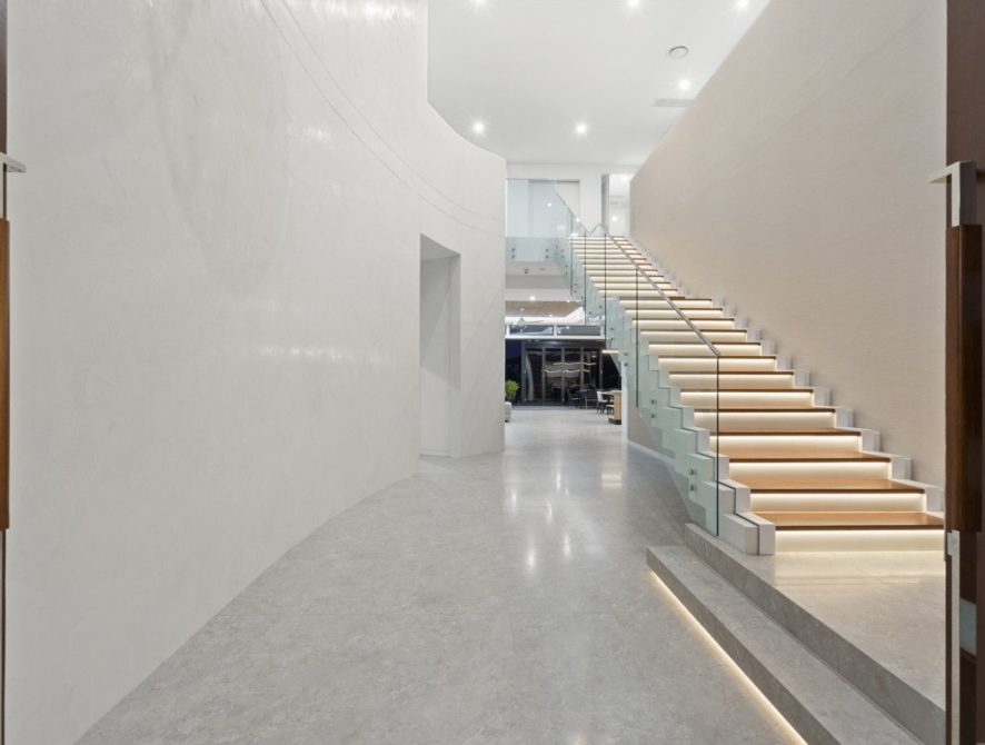 A grand foyer welcomes you to the property, providing an immediate glimpse of the finesse and style that lays beyond, capped off by spectacular stairway with unrivalled design and lighting inclusions. Soaring ceilings and crisp palette lead into a huge open-plan interior encompassing living and dining on a large scale as well as a separate purpose-built media room – an intelligent floorpan allowing for brilliant flow between zones. Boasting seamlessly integrated design elements, the kitchen is an exquisite example of the finest of joinery and kitchen design – a combination of sleek cabinetry storage, timber and stone elements taking centre stage. Hidden away behind the scenes, a separate butlers pantry includes additional storage alongside exceptional cooking and cooling facilities.